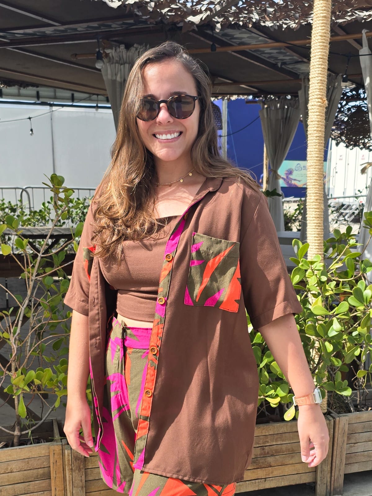 O blusão Feba é a mistura harmônica de dois tecidos: a base marrom e os detalhes como bolsos e palas com estampa vibrante que se destacam na peça, oferencendo exclusividade.