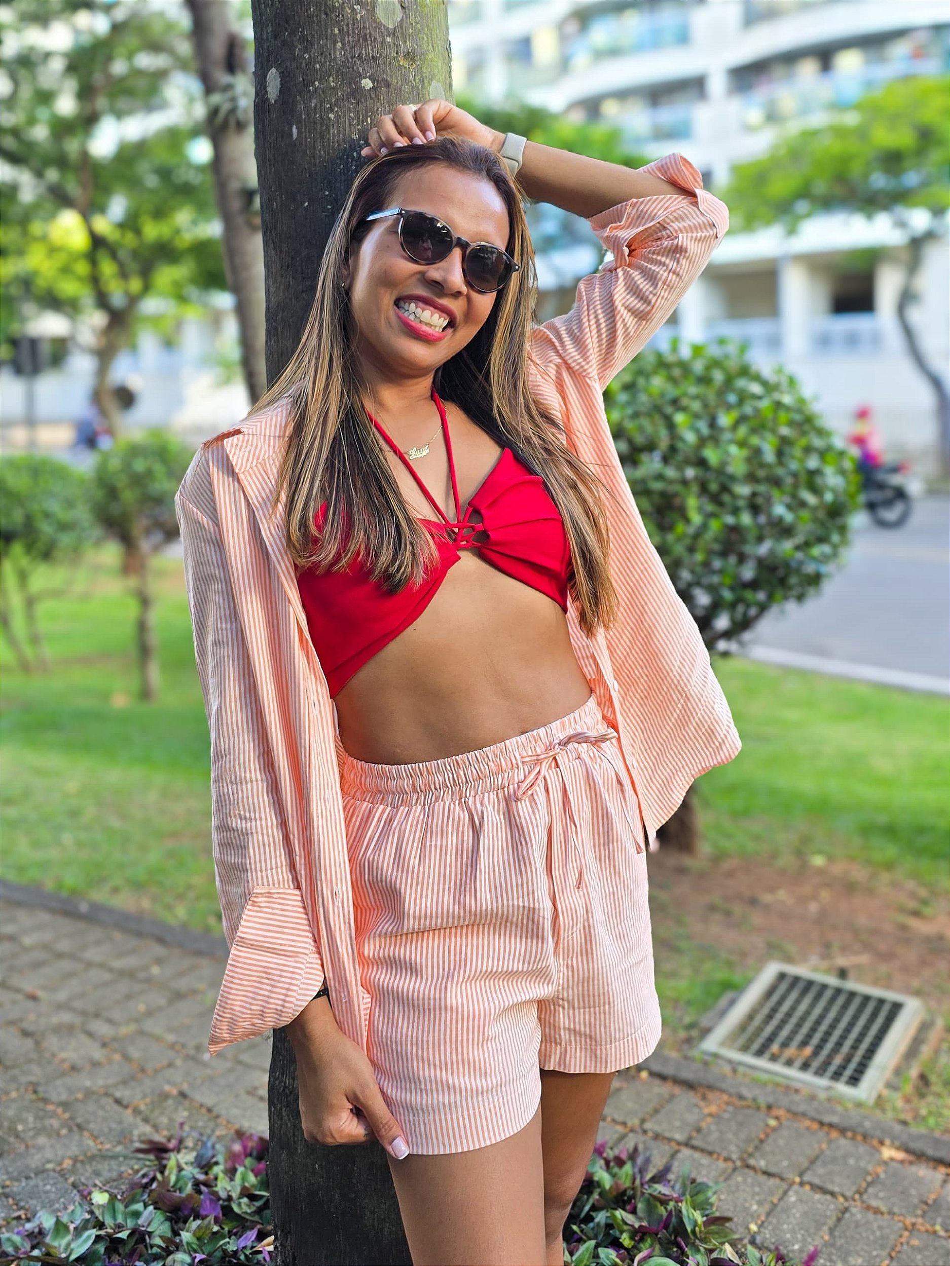 O comprimento é curto na medida certa e o tecido bem leve deixa o movimento solto. Conta também com bolsos laterais funcionais. É uma peça vibe total de passeios nos dias de sol e calor no Rio de Janeiro!