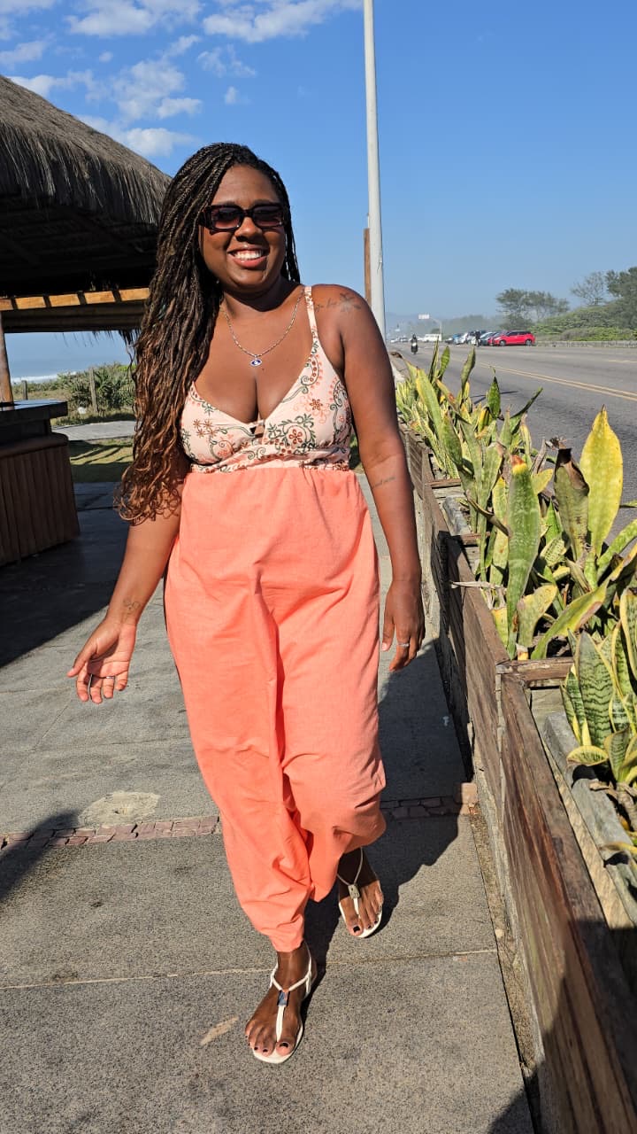 A parte do busto, de laise, cria um contraste lindo e harmônico com a saia lisa, longa, de movimento suave e tom coral: vibrante e fluida na medida certa.